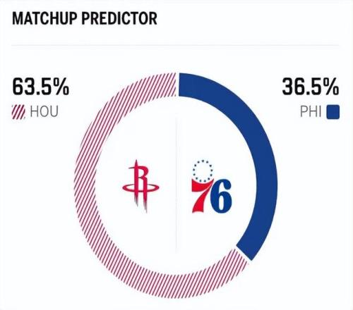 赛前,美媒ESPN对本场比赛进行了胜率预测,火箭队胜率依旧高达63.5% ,占据绝对上风,76人胜率则仅有36.5%,还是不被看好。