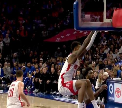 次节回来,恩比德主动造接触再次走上罚球线,申京抱怨:啥都是犯规,你就不能碰他!沃特福德送助攻,格莱姆斯双手砸扣打成2+1,申京先是快下上篮强打2+1,接着再补防大帽直接没收球权,予以回应。阿门假传真突,一步过掉防守起飞滑翔折叠暴扣,锁定今日十佳球。