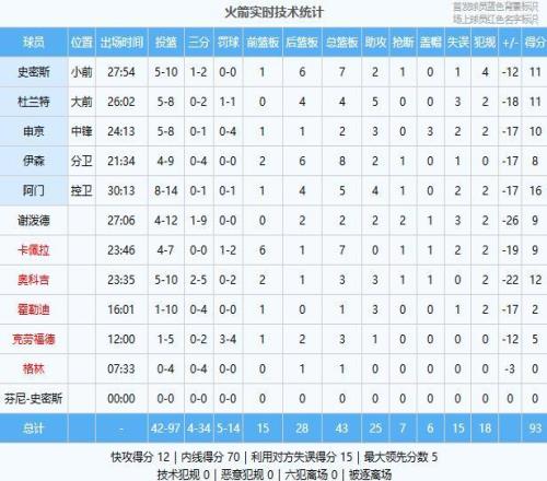 休息归来约基奇三节未打完就完成三双,掘金单节狂轰40分直接拉开20分以上的优势,末节掘金开局再送18-9的攻势彻底杀死比赛悬念,最终火箭客场93-129大比分惨败掘金,赛季交手大比分1-3落后。