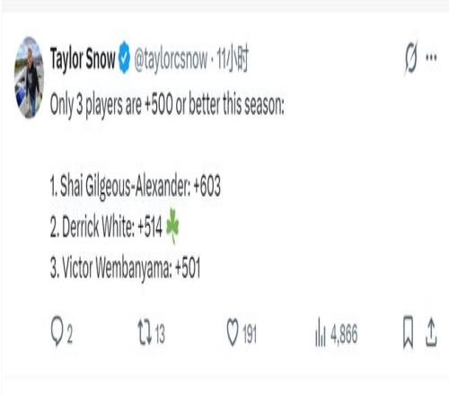 截至今天赛前,全联盟只有三个球员正负值超过+500:亚历山大+603,德里克-怀特+514,文班亚马+501。