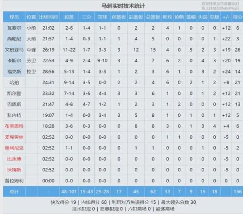 先看看马刺和热火这一场,四节比分(马刺在前):38-31、38-27、32-23、28-30。马刺最多领先到30分,主力三节打卡。文班亚马只打26分钟,投篮22中11,三分7中1,罚球3中3,砍下26分14篮板4助攻5盖帽,正负值+19。