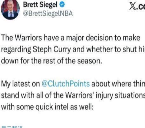 北京时间3月4日,据记者Brett Siegel报道,勇士队面临一个重大决定,那就是是否在常规赛剩余的比赛中让库里回归。...